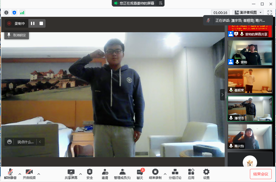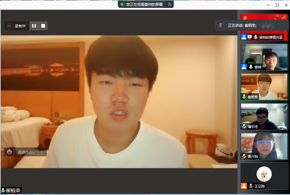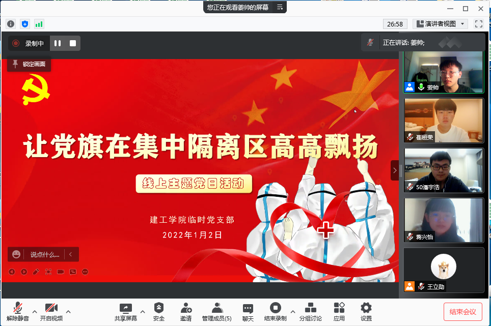 2022年1月1日,太阳城博彩 党委决定在汉庭优佳酒店隔离的学生党员中成立太阳城博彩 隔离区临时党支部。1月2日太阳城博彩 隔离区临时党支部全体党员相聚云端,召开了一次特殊的线上主题党日活动。活动通过腾讯会议召开,由临时党支部书记姜帅主持,支部成员崔桓荣、蒋兴怡、潘宇浩参加了活动。