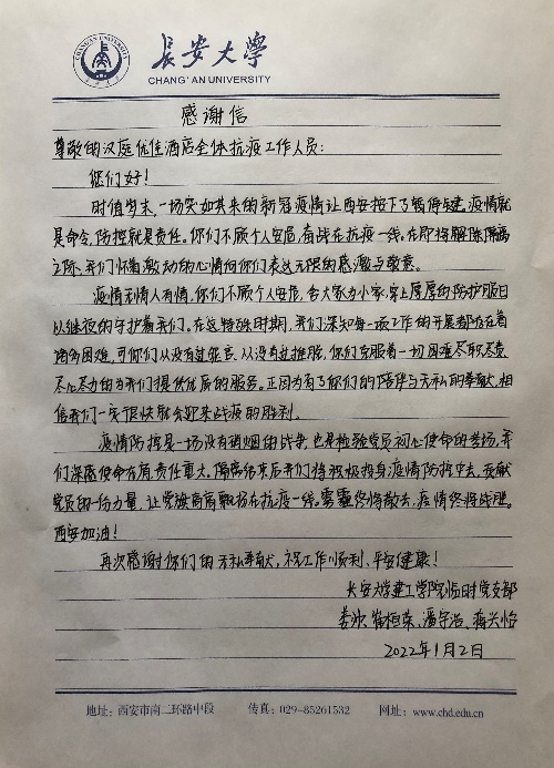 活动结束后,临时党支部书记姜帅代表支部党员给汉庭优佳酒店全体抗疫工作人员写了一封感谢信,并通过线上方式转发给酒店工作人员,表达大家内心无限的感激之情和崇高的敬意。