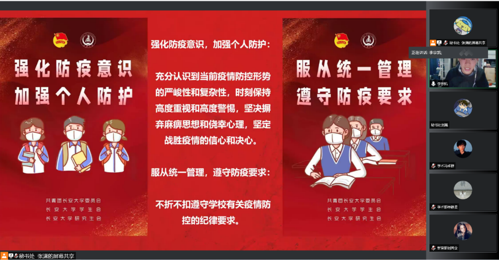 最后,学生会执行主席李宗凯倡议学生会全体团员青年在疫情防控中强化防疫意识,加强个人防护;服从统一管理,遵守防疫要求;健康规律生活,保持阳光心态;争做先锋模范,助力疫情防控。