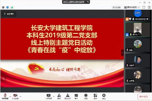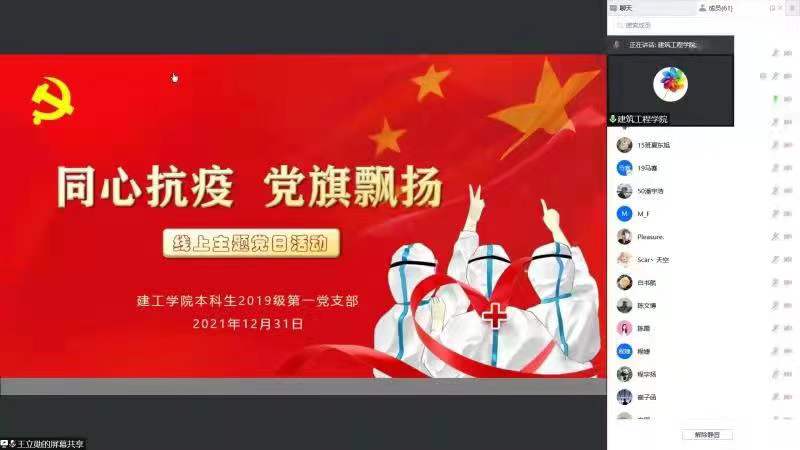 疫情期间,支部对党员和积极分子的培养也并未松懈。2021年12月31日,2019级第一党支部开展“同心抗疫,党旗飘扬”线上主题党日活动,共同收看国家主席习近平的新年贺词,回顾这一年来的付出与收获,共同学习伟大抗疫精神,从抗疫斗争中凝聚精神力量,思政班主任陈英分享太阳城博彩 教职工志愿者抗疫背后的故事,彰显同舟共济、守望相助的家国情怀。1月1日,2019级第二党支部开展“青春在战疫中绽放”线上特别主题党日活动,深入学习贯彻习近平总书记关于疫情防控工作的重要指示精神,赵玺、王牧佳、唐柯靖等党员志愿者分享志愿服务体会与感悟,志愿者贾祎恒说,“作为一名学生党员,第一时间响应号召,投入抗疫一线,我感到非常荣耀”。通过特别主题党日活动,提升了支部党员的凝聚力,增强了全体党员打赢疫情防控阻击战的信心。