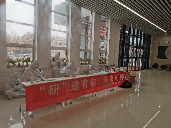 2021年12月25日,冬雪骤至,寒风凛冽,恶劣的天气给因疫情本就困难重重的研考工作带来更大的压力和挑战。2019级韦佳怡、裴心悦、张焕宙、胡定奇、回泽、程婕、胡俏儿、马颖、程宇扬等党员志愿者不畏严寒,顶着风雪,路线指引、秩序维护、物资管理、设备调试,处处可见他们的身影,如同一簇