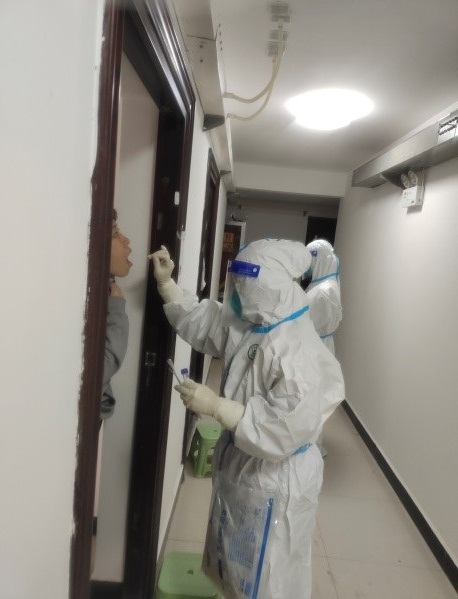 解除居家隔离后,刘钦老师第一时间向社区志愿者团队报到,与社区工作人员及志愿者一道坚持轮岗协助完成全员核酸检测工作、协助物业保安执勤、为社区住户送物资等等的工作中。陈医生也在解除隔离当天便随队前往向阳沟集中隔离区域进行医务志愿者工作,主要负责重点隔离人员的核酸采集工作。最忙的时候,每天要到半夜,才能视频看一下熟睡的孩子们。尽管最近天气寒冷,户外工作环境恶劣,但他们无怨无悔,默默付出。目前,刘钦老师所在志愿者团队自发组织形成网络化管理体系,以党员志愿者优先,为每栋楼安排一名常驻志愿者负责人,刘钦老师主动担起了所在的19号楼的志愿服务工作。