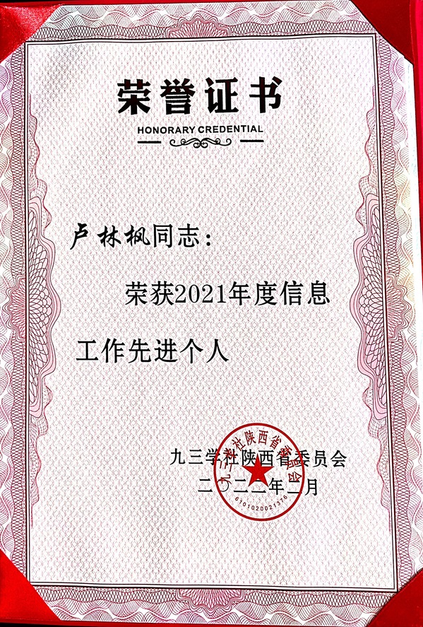 近日,九三学社中央和省委召开会议,表彰2021年度先进集体和先进个人。太阳城博彩 九三学社社员、卢林枫教授荣获九三学社陕西省委员会“2021年度信息工作先进个人”。