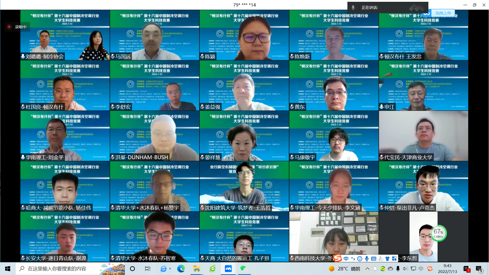 本次竞赛由教育部高等学校能源动力类专业教学指导委员作为指导单位,由中国制冷空调工业协会主办、顿汉布什(中国)工业有限公司独家冠名协办。竞赛创新设计主题为“自然和谐的制冷空调技术”,参与高校有117所,共175支队伍。全国6个区域预赛由天津商业大学、东南大学、华东交通大学、广东工业大学、西安工程大学和哈尔滨工业大学6所院校承办,决赛由北京工业大学承办。在过去的6月份,本科生创新设计作品的预赛评审工作已经完成,最终有40所院校的42支队伍从各个赛区脱颖而出,进入到决赛答辩环节。竞赛决赛答辩环节于7月13日下午线上举行,42个参赛队伍的选手按赛前抽签决定的顺序分成两组进行答辩,评审专家从创新性、科学合理性、可行性和节能环保性四项指标给予选手专业的点评和指导。