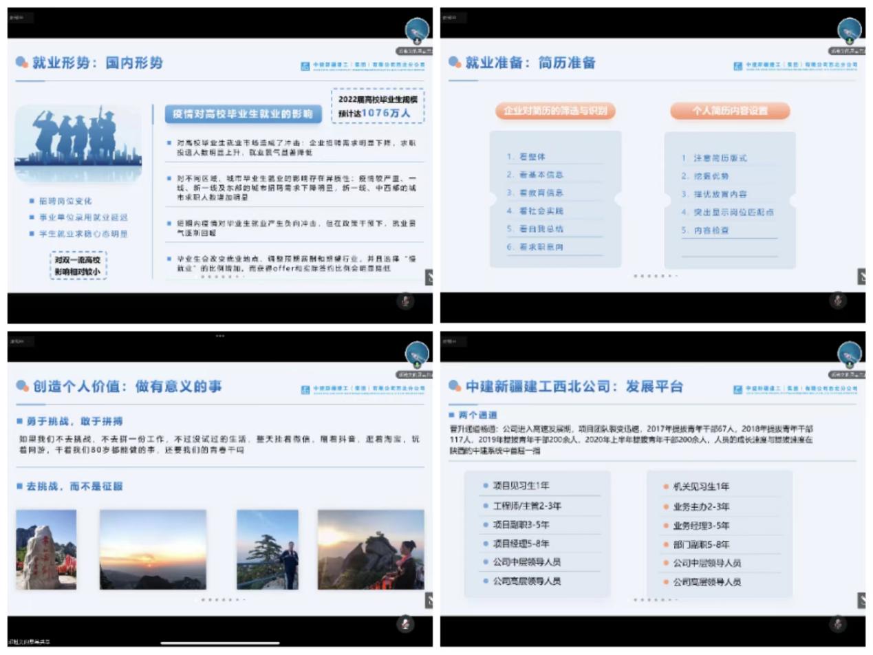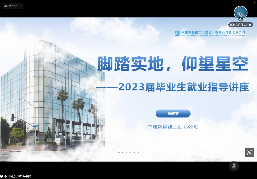 为进一步做好2023届毕业生就业工作,不断提升毕业生的就业能力,太阳城博彩 于7月18日举办了2023届毕业生线上就业指导讲座。讲座由中建新疆建工西北公司助理总经理兼人力资源部经理邓雅文主讲,太阳城博彩 党委副书记孟庆鹏,学生工作办公室主任刘云博,2019级辅导员王立勋、寇大为,2023届本科毕业生参加了活动。
