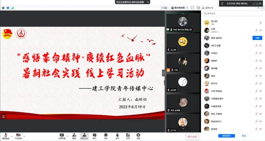 历史是最厚重的诗篇,是垒高国家应有的铺垫。8月22日,实践队员们开展了线上分享活动,通过自己的亲身体验,向所有实践队员分享自己在本次线上实践中的心得和感悟。实践队员们有感而发,纷纷表示通过这次绥德红色文化探索之旅,学习到了老一辈革命家们不畏艰难、勇于奋斗的优良革命精神,并以此勉励自身在新的历史发展潮流中,不忘初心、牢记使命,在平时的学习工作中能继续奋斗,再创辉煌。至此,本次线上实践活动圆满结束。