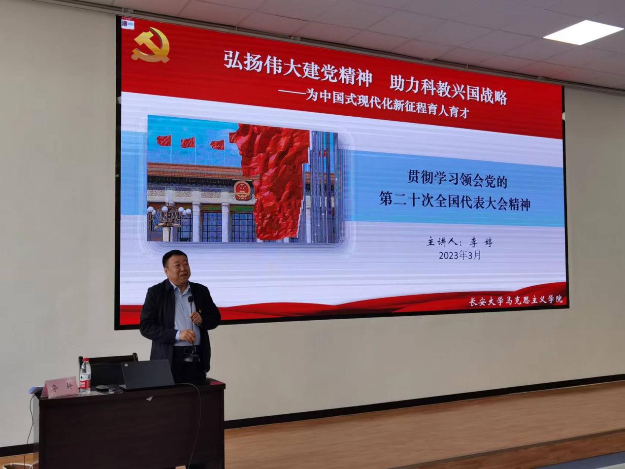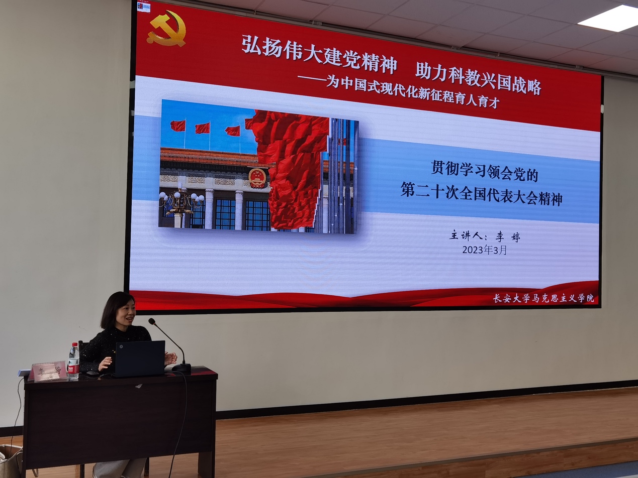 李婷副教授从三个部分进行了专题报告。第一部分是党的二十大报告要点解读,分别从主题、意义、任务、内容框架、亮点这几个方面进行详细解读。第二部分的主题是弘扬伟大建党精神,奋进新征程。伟大的建党精神是:坚持真理、坚守理想,践行初心、担当使命,不怕牺牲、英勇斗争,对党忠诚、不负人民。报告第三部分是落实党的二十大精神,助力科教兴国战略。分为以下几个方面:办好人民满意的教育;完善科技创新体系;加快实施创新驱动发展战略;深入实施人才强国战略。