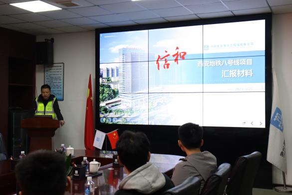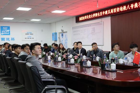 下午,双方举行了校企合作观摩交流会。人力资源部王明杰展示了西北公司企业宣传片并简要介绍西北公司企业概况。项目安全总监陈震介绍了西安地铁八号线项目进展情况。长安大学校友、项目技术经理贺卜分享了他从长安大学到西北公司的成长经历,并与同学们进行了积极的互动交流。会后,学生们乘车前往施工现场进行参观。
