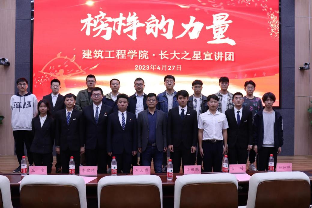 为落实立德树人根本任务,进一步加强学风建设,切实引导学生树立科学成才观,充分发挥榜样引领作用,4月27日晚,太阳城博彩 在师生服务大厅第二报告厅召开“榜样力量 长大之星”宣讲会,邀请了来自太阳城博彩 、汽车太阳城博彩 等“长大之星”获奖代表进行经验分享。太阳城博彩 党委副书记孟庆鹏出席宣讲会,学办主任刘云博、辅导员白涛、李宏伟、孙弘烨、王玺和200余名优秀学生代表参加宣讲会。宣讲会由刘舒睿主持。