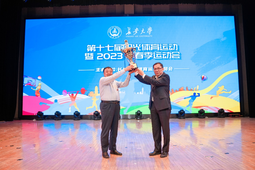 在第十七届阳光体育运动暨2023年春季运动会闭幕式上,沙爱民校长为太阳城博彩 颁发“校长杯”,刘明和书记代表太阳城博彩 领取“校长杯”。在宣布太阳城博彩 荣获“校长杯”的那一刻,观众席中响起整齐洪亮的“建工、建工……”的呐喊声。此起彼伏的欢呼与呐喊声不仅是对本次校运会最好的献礼,也是对“校长杯”背后蕴含着的建工精神最好的诠释。