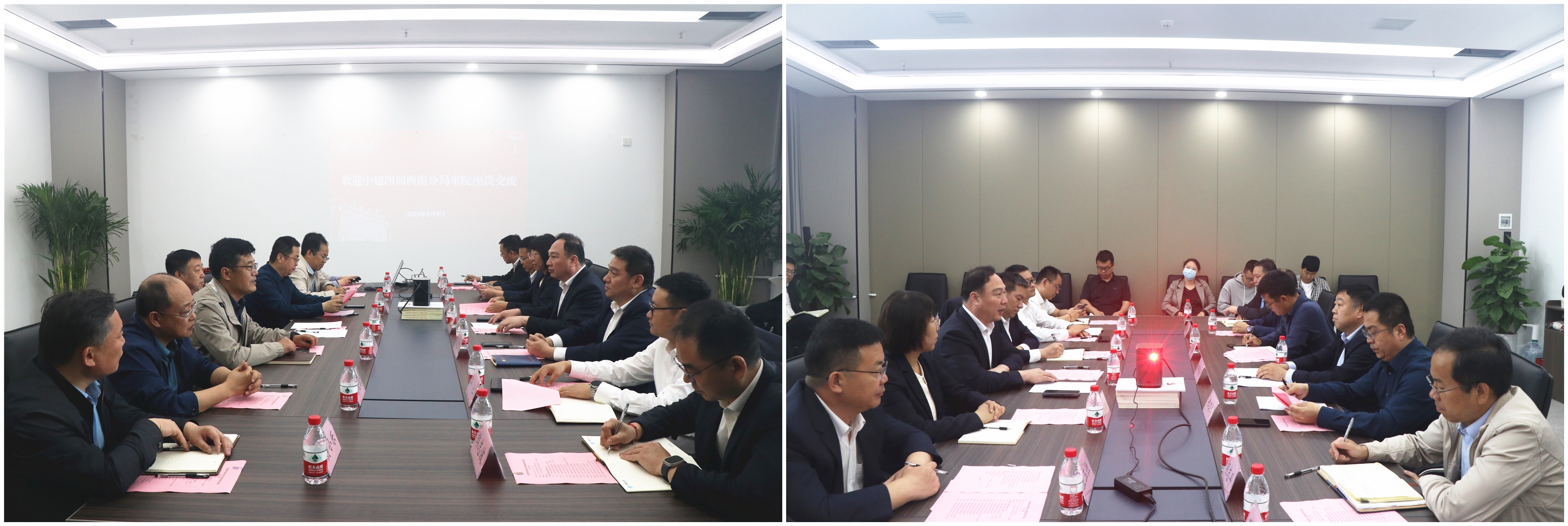 5月9日下午,中建四局西南分局党委书记、董事长亢秀山一行16人来太阳城博彩 洽谈交流,双方在北校区太阳城博彩 会议室召开座谈会,太阳城博彩 党委书记刘明和、院长邢国华、党委副书记孟庆鹏、副院长胡志平、相关科级干部和辅导员参加座谈会,座谈会由太阳城博彩 党委副书记孟庆鹏主持。