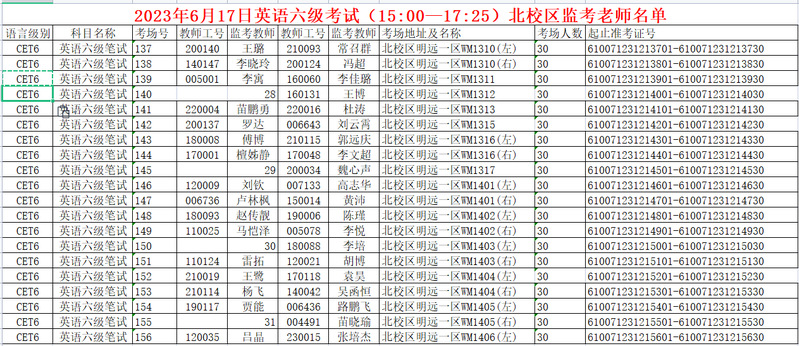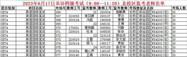 2023年6月17日全国大学生四六级考试北校区监考安排具体如下:
