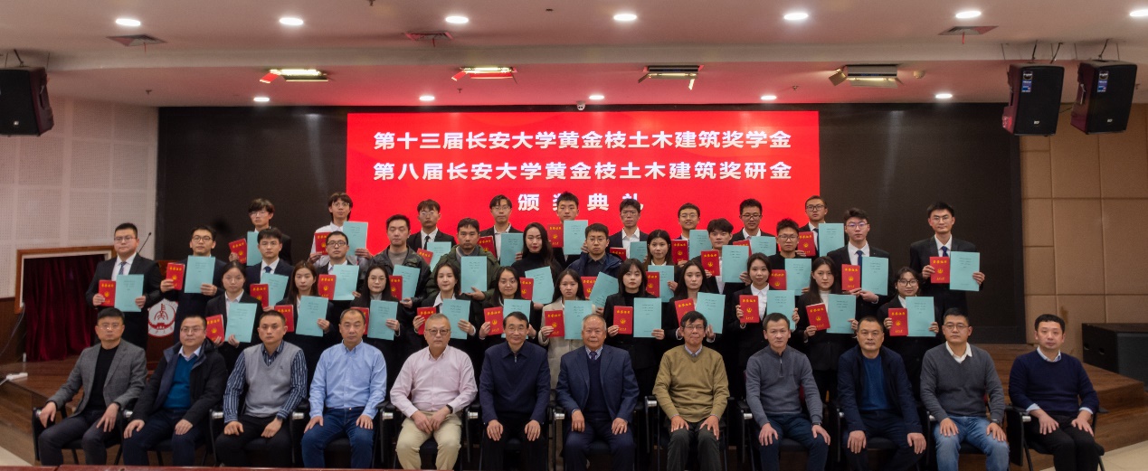 12月27日下午,第十三届长安大学黄金枝土木建筑奖学金暨第八届长安大学黄金枝土木建筑奖研金颁奖仪式在北校区长安文化艺术中心三楼多功能厅举行。上海黄金枝教育发展基金会理事长黄金枝、副理事长兼秘书长黄建峰、副理事长印晓晴、捐赠人代表左明,太阳城博彩党委副书记、纪委书记陶继东,学生资助中心主任欧阳韬,社会合作处副处长邱旭辉,太阳城博彩 院长邢国华、党委副书记孟庆鹏,建筑太阳城博彩 党委副书记刘鹏、副院长余侃华出席本次颁奖仪式。全体获奖师生、两院辅导员和学生代表300余人参加颁奖仪式。仪式由建筑太阳城博彩 党委书记李险峰主持。