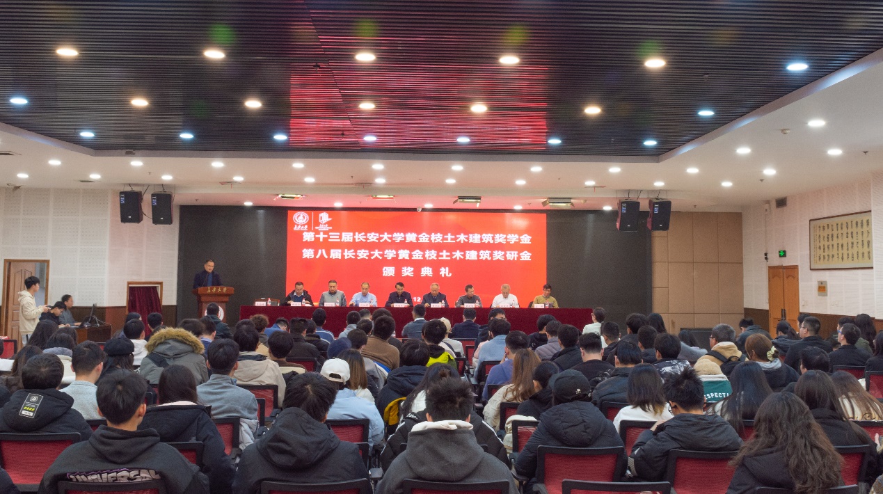 12月27日下午,第十三届长安大学黄金枝土木建筑奖学金暨第八届长安大学黄金枝土木建筑奖研金颁奖仪式在北校区长安文化艺术中心三楼多功能厅举行。上海黄金枝教育发展基金会理事长黄金枝、副理事长兼秘书长黄建峰、副理事长印晓晴、捐赠人代表左明,太阳城博彩党委副书记、纪委书记陶继东,学生资助中心主任欧阳韬,社会合作处副处长邱旭辉,太阳城博彩 院长邢国华、党委副书记孟庆鹏,建筑太阳城博彩 党委副书记刘鹏、副院长余侃华出席本次颁奖仪式。全体获奖师生、两院辅导员和学生代表300余人参加颁奖仪式。仪式由建筑太阳城博彩 党委书记李险峰主持。