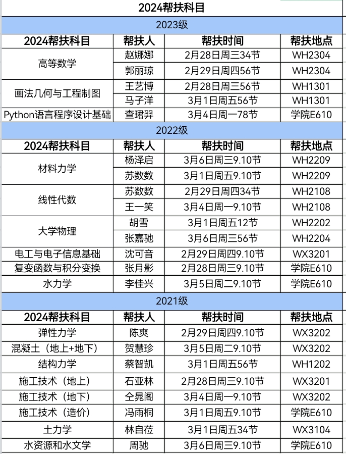 本次学业帮扶将对2021级弹性力学、土力学、结构力学等重难点专业科目,2022级材料力学、线性代数等重难点基础科目,2023级高等数学、画法几何与工程制图等重难点基础科目,进行期末试题讲解、考试重难点解析答疑。