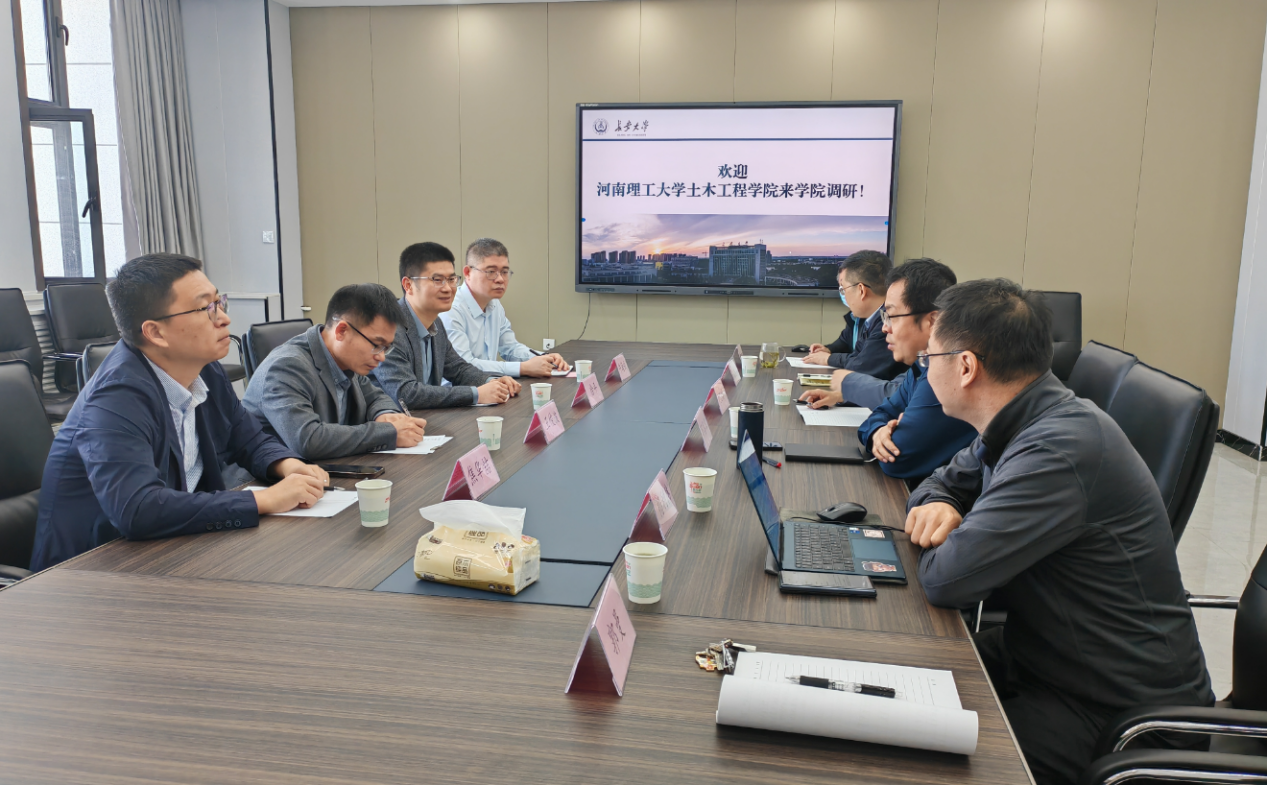 4月12日上午,河南理工大学土木工程太阳城博彩 副院长徐平带队来太阳城博彩 调研,太阳城博彩 院长邢国华、给排水科学与工程系主任杨利伟、建筑工程实验室主任马恺泽、混凝土与砌体结构教研室教师王博、专业建设及教学主管黄小乐、学科建设兼科研实验主管郭曼参加了此次交流会。