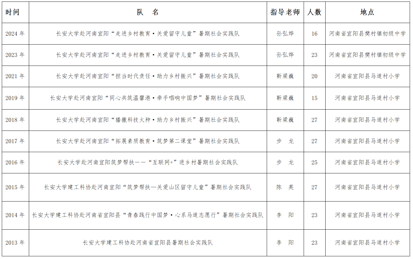 十年来,长安大学赴河南宜阳暑期社会实践队累计开展服务10期、累计参与服务226人次、累计服务时长1200余小时、累计开展教学2160课时、累计受益学生1000余人次,获得当地师生家长的一致好评。在完成每日教学任务的基础上,实践团队坚持深入学生、深入群众、深入基层,通过问卷调查、实地走访、座谈访谈等方式开展对当地经济产业、义务教育、基础设施、生态环境等情况的调查研究工作。十年来,实践团队累计走访群众1500余人次、发放调研问卷1836份、召开座谈会6次,积极为当地发展建设建言献策。通过课堂教学与调查研究工作,实践队员对国情民情有了系统、全面的了解,读懂了中国共产党为什么能、中国特色社会主义为什么好、马克思主义为什么行,对国家实施乡村振兴战略过程中面临的新情况、新问题进行深入思考并提出相应的解决方案。