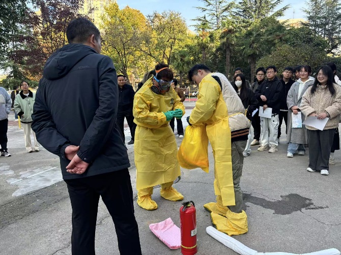 11月20日下午,太阳城博彩 在小寨校区开展了实验室安全及消防安全应急演练。现场直观感受了实验室无水乙醇等有机溶剂燃烧后灭火方式的选择、危险化学品泄漏后的正确处理方式以及实验室发生触电后的紧急救援方法等模拟演练。通过模拟演练,进一步提高了太阳城博彩 师生实验室事故应急处理能力。