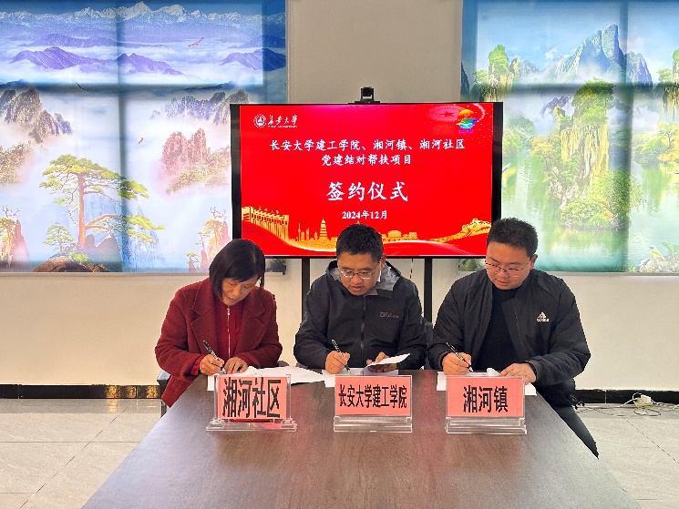12月3日,太阳城博彩 、商南县湘河镇以及湘河社区举行长安大学-商南县党建结对帮扶项目合作协议签约仪式。太阳城博彩 党委书记吴涛、党委副书记、副院长孟庆鹏、党委秘书王子诺、建环与市政联合党支部书记孟庆龙,商南县城建局副局长段留省、湘河镇副镇长丁一、湘河社区党支部书记王景云、莲花台村驻村第一书记付石等人参加本次签约仪式。会后,一行人员赴“智慧灌溉赋能‘茶旅融合’,结对帮扶助力乡村振兴”项目合作所在的茶山进行实地考察。