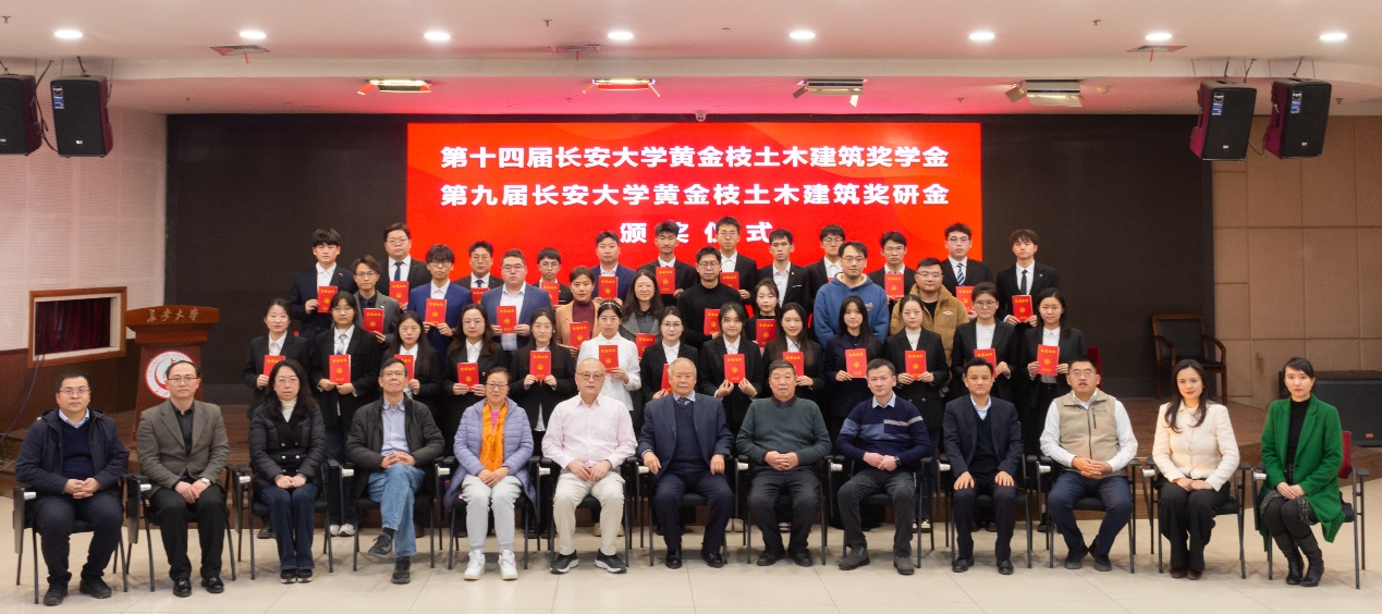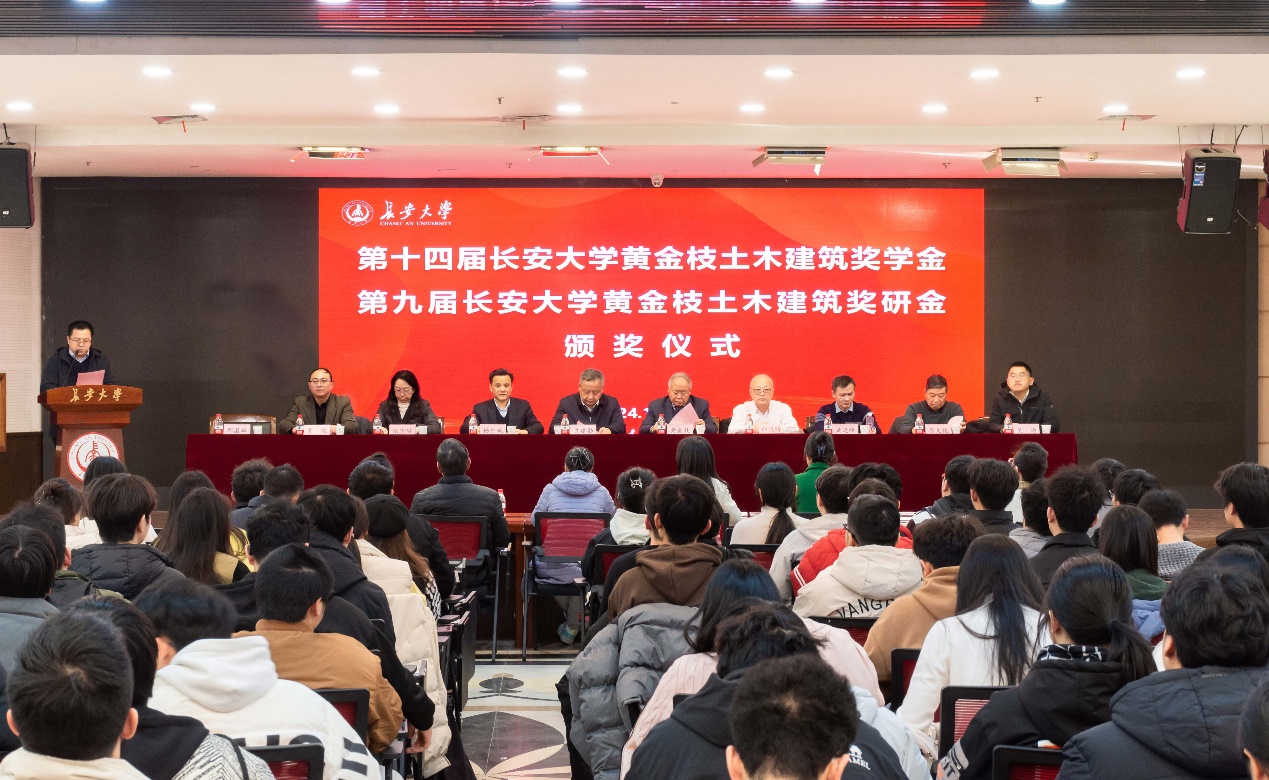 12月27日下午,第十四届长安大学黄金枝土木建筑奖学金暨第九届长安大学黄金枝土木建筑奖研金颁奖仪式在北校区长安文化艺术中心三楼多功能厅举行。上海黄金枝教育发展基金会理事长黄金枝,副理事长印晓晴,副理事长兼秘书长黄建峰,同济大学土木工程太阳城博彩 教授屈文俊,捐赠人代表冯晓慧、左明,太阳城博彩副校长陈建勋,社会合作处处长、教育基金会理事长杨红斌,学生资助中心主任张晓琳,太阳城博彩 党委书记吴涛,建筑太阳城博彩 党委书记贾侃,太阳城博彩 党委副书记马熠航,建筑太阳城博彩 党委副书记王妍婷出席颁奖仪式。全体获奖师生、两院辅导员和学生代表200余人参加颁奖仪式。仪式由太阳城博彩 院长邢国华主持。