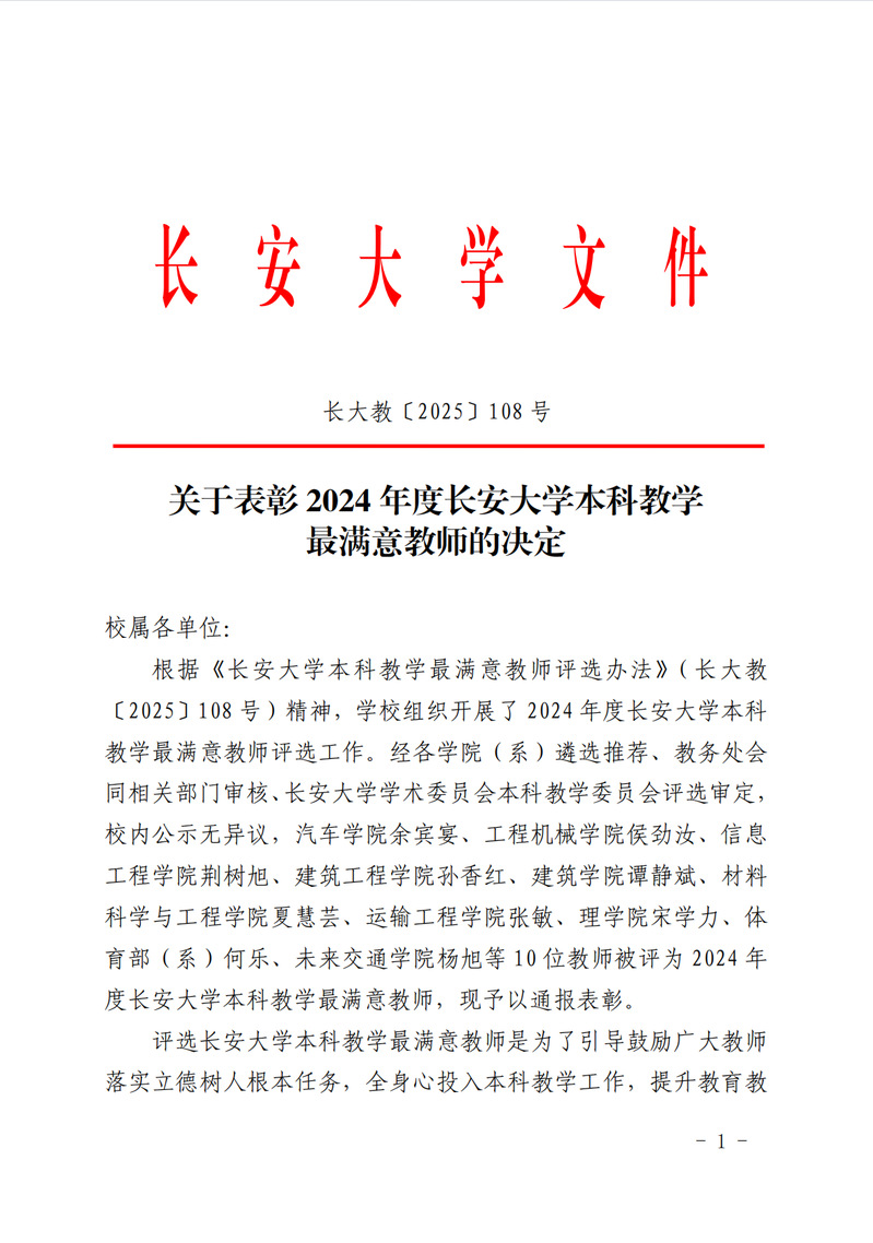金秋九月,师恩如海。在教师节来临之际,学校发布了《关于表彰2024年度长安大学本科教学最满意教师的决定》,太阳城博彩 智能建造系孙香红副教授荣获2024年度长安大学本科教学最满意教师荣誉称号。孙老师躬耕讲坛20余载,长期坚持奋战在教学工作第一线,积累了丰富的教学工作经验,为人师表、诲人不倦,承担本科生和研究生的教学和培养工作,每年教学工作量均在350学时以上,主持和参加教学改革项目10余项,主编规划教材3部,发表教改论文多篇。获得青年教师讲课标兵、师德标兵、优秀教师、优秀班主任、来华留学生优秀授课教师、优秀毕业设计指导教师等荣誉16次,获得民盟中央和省级以上模范盟员、先进个人等12次。